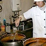 菊一あられ自慢のたまり醤油ベースの「秘伝のたれ」は、あられの種類に合わせて丁寧に時間を掛けて調合を行います。必要な分だけをその都度仕上げるため毎日欠かせない作業です。 |